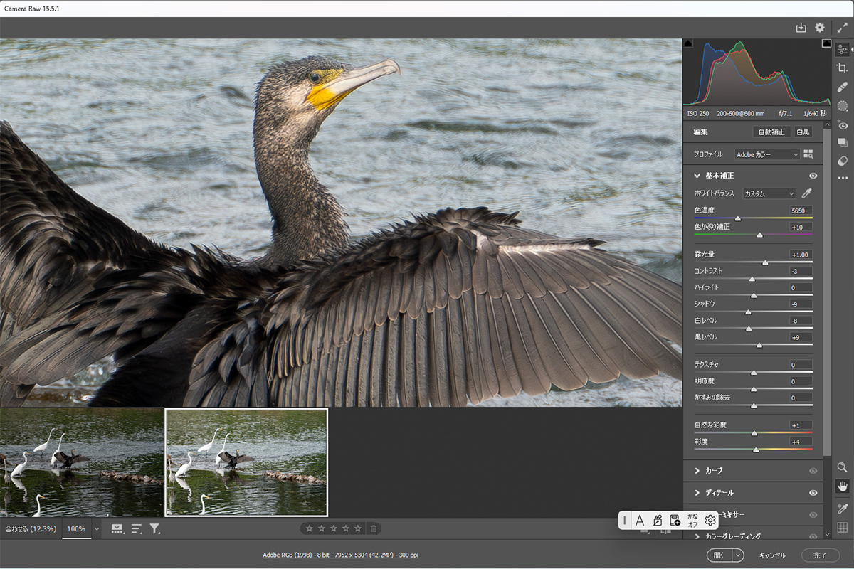 | AdobeのPhotoShopから「ファイル」→「開く」でRAW形式のファイルを開くかRAW形式のファイルをドラッグ&ドロップするとCamera Rawが起動して上記のような画面が出てきます。 |