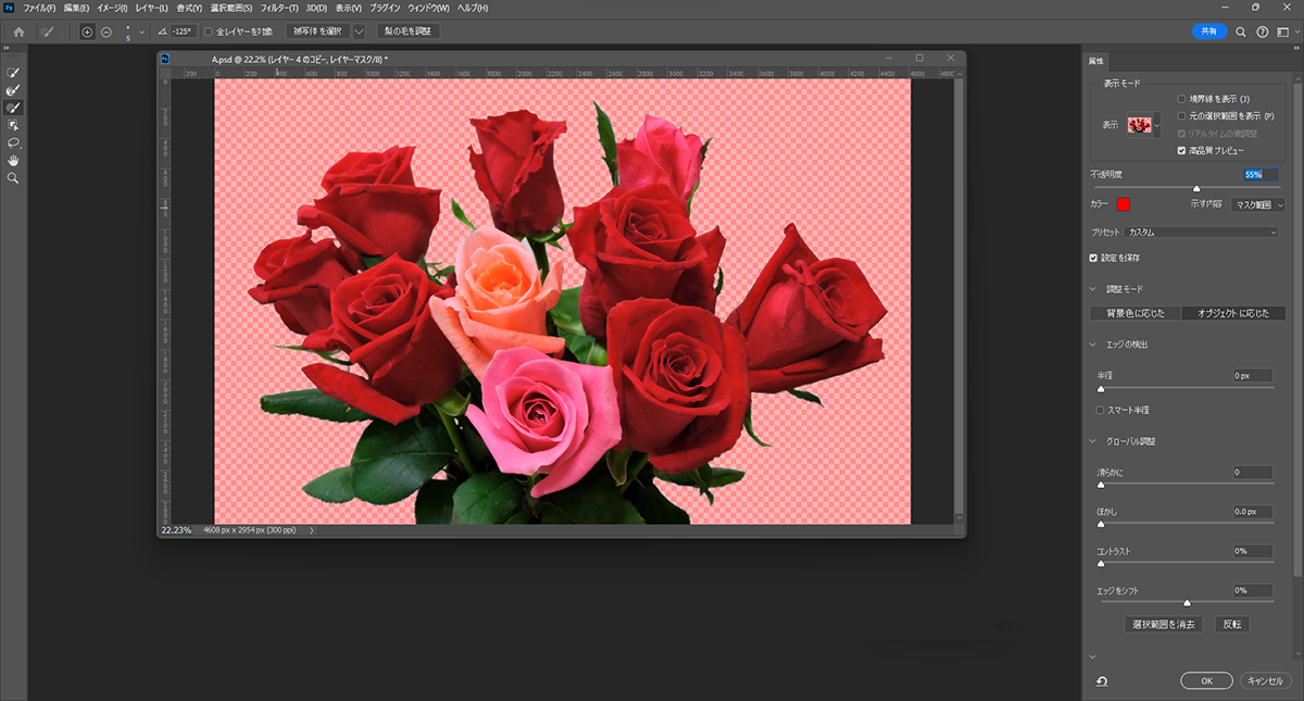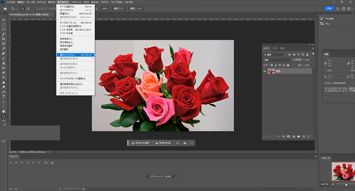 「背景の削除」ツールでざっくりと消す方法から更に詳細に切り抜く方法です。AdobeのPhotoShopを起動して不写真ファイルを開きツールバーから「選択範囲」→「選択とマスク」を選びます。