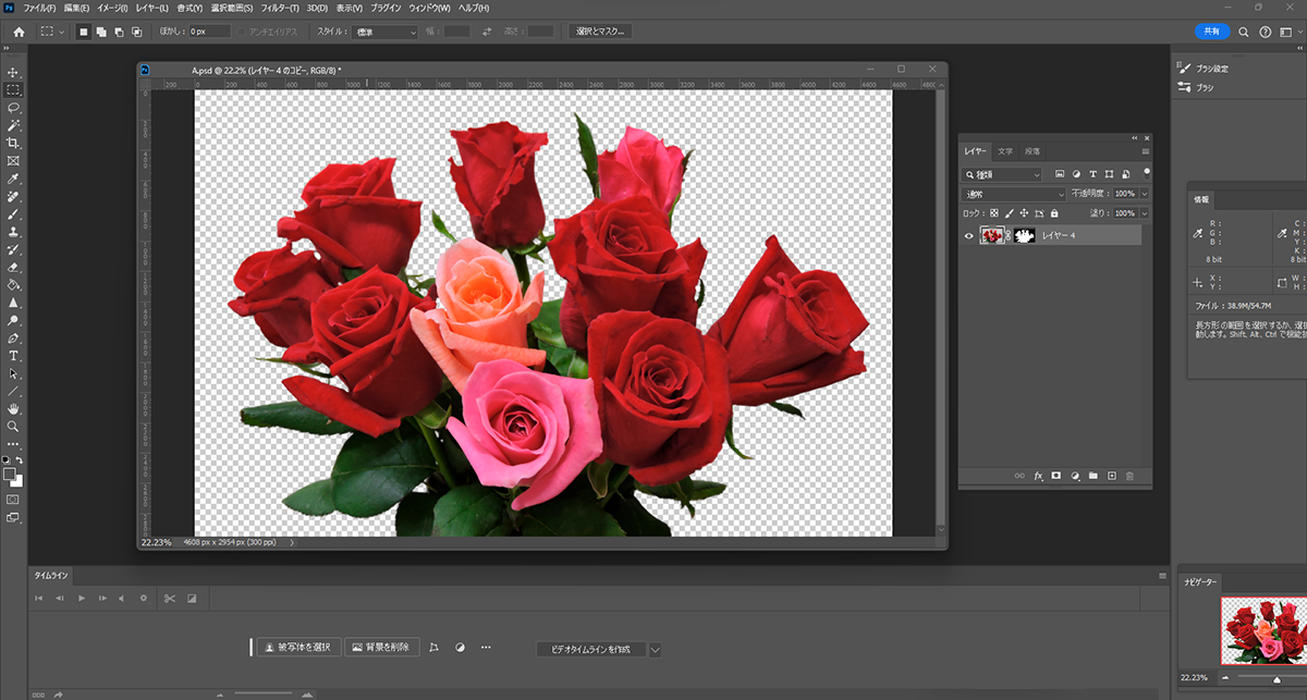 諸々選択が終わったら右下の「開く」のボタンを押すと下記のような通常のPhotoShopの画面に戻ります。これで背景を綺麗に消去したレイヤーマスク処理した画像になります。