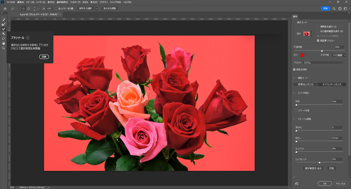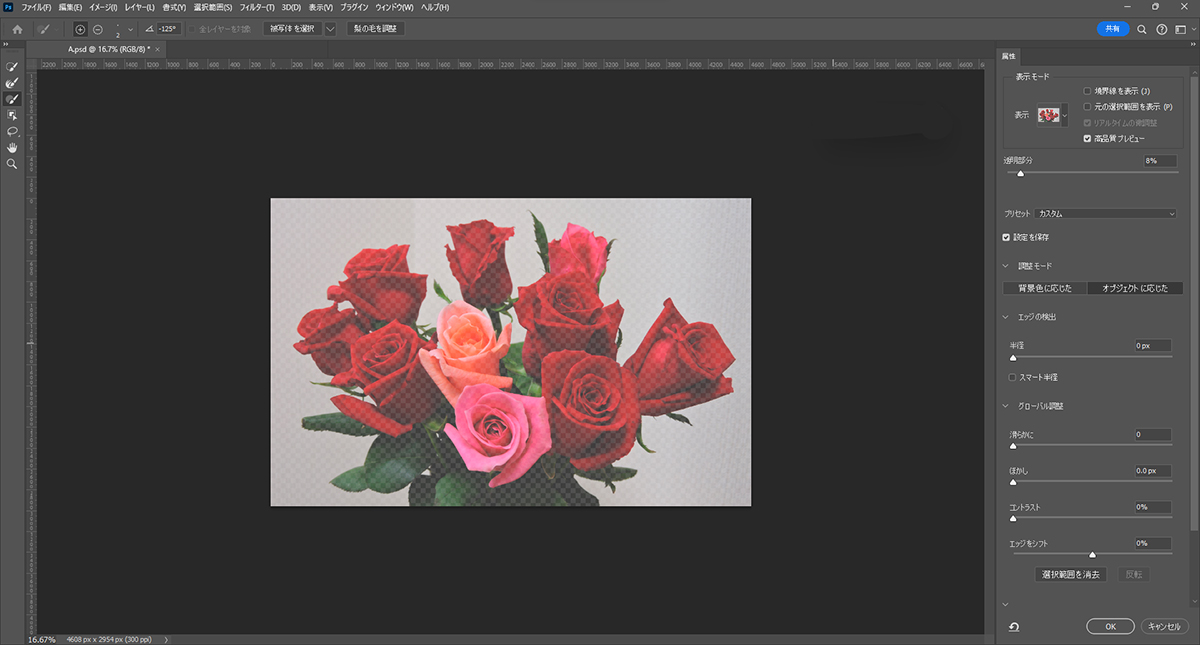 大雑把に選んだ後もっと詳細に細やかな部分を選んでゆきます。「クイック選択ツール 」の下の「ブラシツール」を使います。ブラシの大きさは上部のツールバーでサイズを選びプラスにしてドラッグしながら選んでゆきます。小さなサイズにすると細やかな部分を選択できます。選び直したい場合はマイナスにして選びなおします。右の方に「グローバル調整」がありますので画像を見ながら抜きたい部分のエッジをぼかしたり滑らかにしたり調整してゆきます。「クイック選択ツール 」と違って細やかで詳細な作業が「ブラシツール」になります。