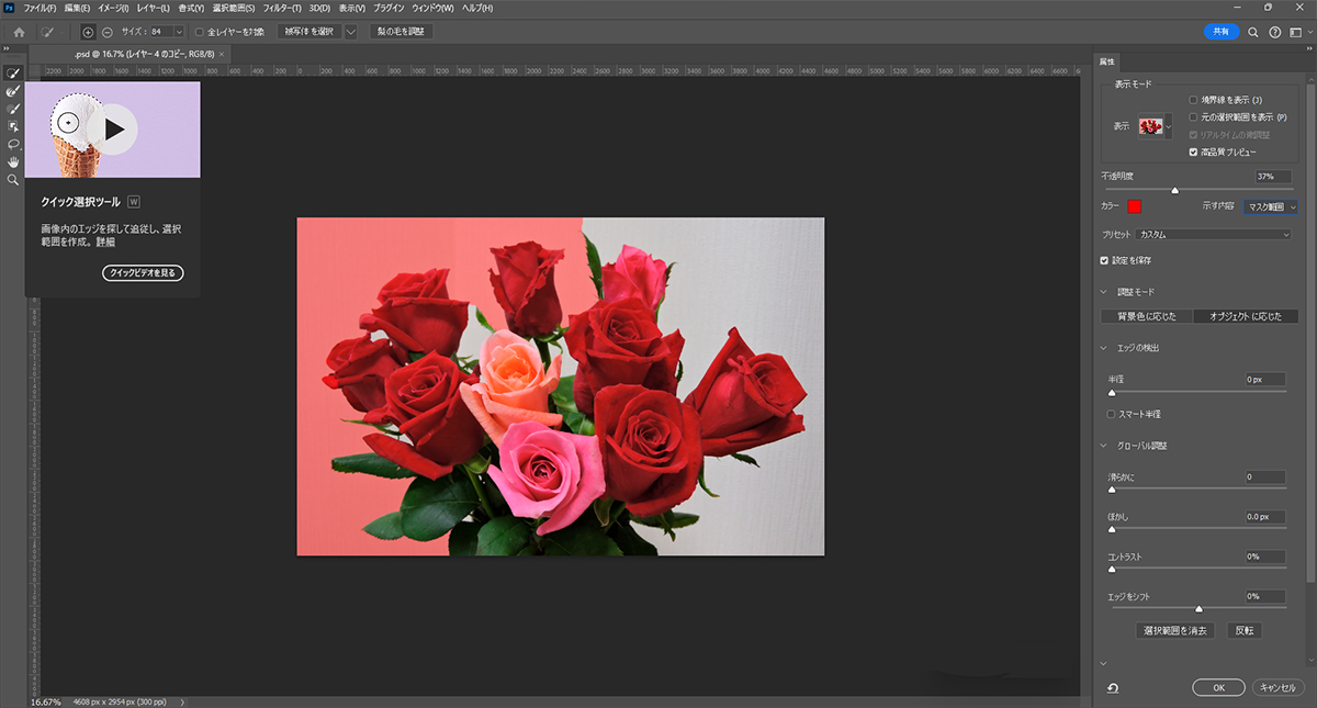 すると上記のようなワークスペースの画面が出てきます。右にある「クイック選択ツール 」で消したい個所をドラッグして消したい部分を大雑把に選んでいきます。消すのとは反対に切り抜きたい場合は切り抜きたい個所を大雑把にドラッグして選んでゆきます。選んだ箇所が分かりやすいように表示モードを「オーバーレイ」にしておきます。このほかに「オニオンスキャン」など表示モードがありますので使う方法で作業が確認できます。