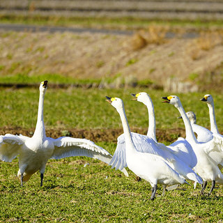 コハクチョウの北帰 オオワシの北帰と同じくコハクチョウも一気に北帰しているようです。湖西に居たコハクチョウ達も湖北に合流しており2月28日の時点で60羽ちょい。半分以下に激減してます。湖北も2月27日の時点で700羽ちょいほど居たようですが2月28日には100羽ほど北帰した模様。写真は2月27日撮影です。「みんなぁ、明日、帰ろうかぁ」などと話し合っているようです。「最後にお別れの歌を歌いましょう。湖北のみなさん、また秋に会いましょう」って。 タグ: #コハクチョウ, #湖北, 北帰, 滋賀県長浜, 野鳥 前の記事 次の記事