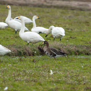 早い所では先月の、1月末頃からコハクチョウやマガンの北帰が始まっています。例年よりかなり早い北帰です。このエリアのコハクチョウ達も早めに旅立つのかもしれません。しきりに羽を休めている様子がうかがえます。まだ180羽近く居りますがその中に1羽のマガンが群れに混じっておりました。普通仲間と共に行動してますので周りにいないか探してみましたが居りません。1羽でいると云うことはどうやら北帰の途中ではぐれたようです。幸いコハクチョウと仲良くしていますので天敵に襲われることは無いと思います。対岸の湖北にはまだ仲間が残っていますのでしばらく様子を見て見ようと思います。