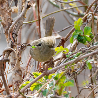 先日に続き再度、ウグイスの住処を訪れた。最初は警戒してシーンとしてるけどしばらくそこで耳を澄ましているとジッジッと2か所で鳴き交わす声がしてくる。私をどちらからか遠ざけようとしているようだった。なので近くで鳴く方を選んで茂みの足元をそーっと見るとドンピシャ、絡んだ枝の中でぴょこぴょこと動き回っていた。そのままじーっと観察してみた。するとやはり先日と同じように新緑を好んで食べている。私たちがフキノトウやタラの芽を好んで食べるようにウグイスも初物の味を楽しんでいた。この時期ジッジッと地鳴きが聞こえたらその近くの新緑を観察してみるのも面白いと思います。